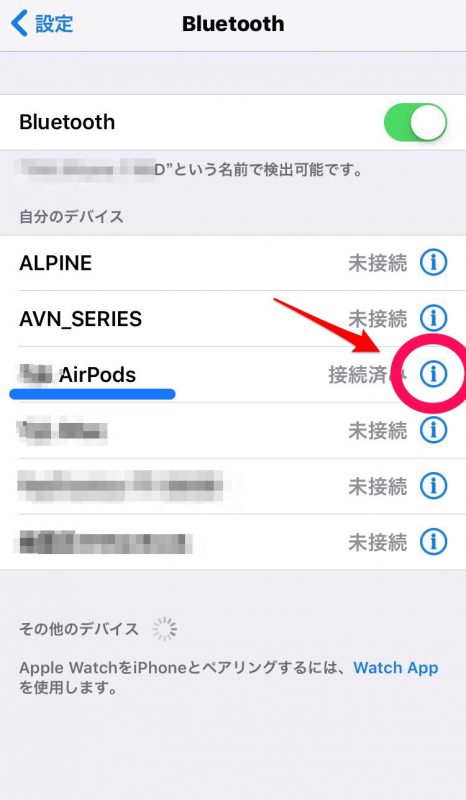接続している Bluetoothのデバイス一覧から自分のAir Podsが接続表示されている事を確認し、一番右にある「 i 」のボタン(赤丸のところ)をタップしましょう。