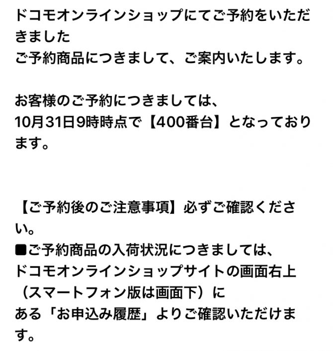 【追記】2日程前に ドコモオンラインショップに自分の予約が何番目かの問い合わせをしていたんですが 本申し込みが終わったあとに返答メールがきてました。