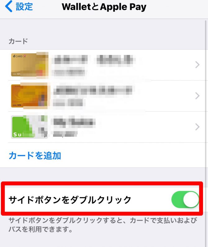 「サイドボタンをダブルクリック」という項目が ONになっていれば iPhone X が スリープ状態でも 電源ボタンをダブルクリックすると「Wallet」アプリが立ち上がります。