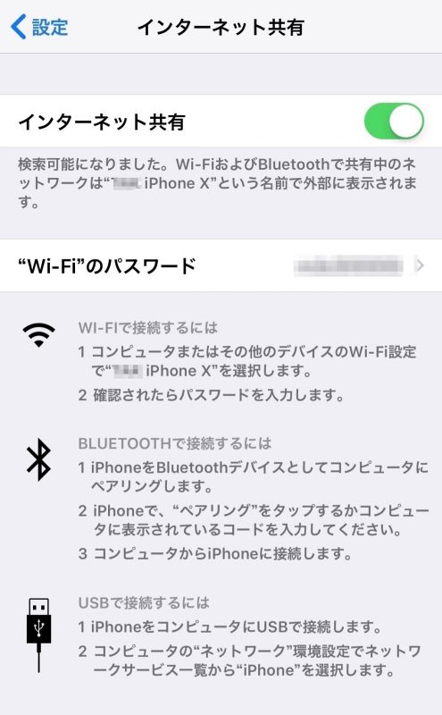 iPhone側のインターネット共有のボタンは ON・OFF どちらでも可です。