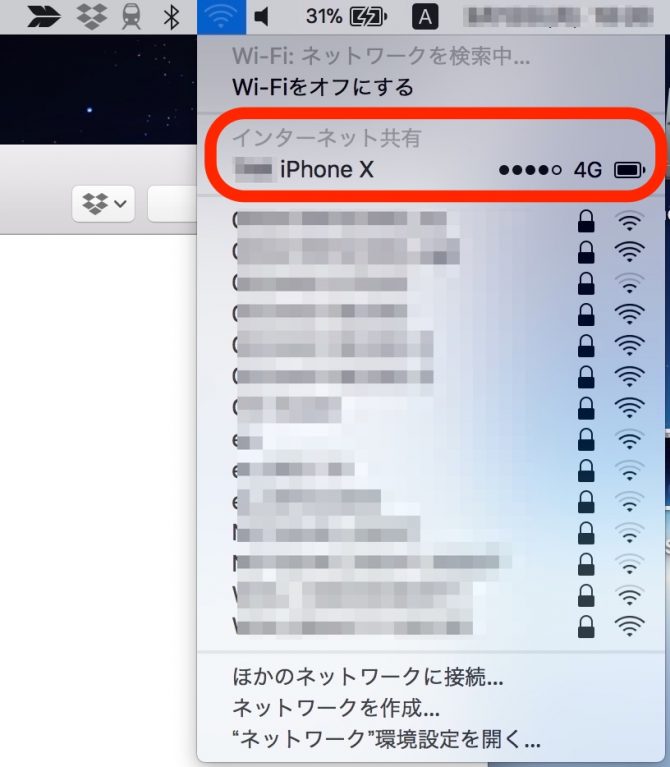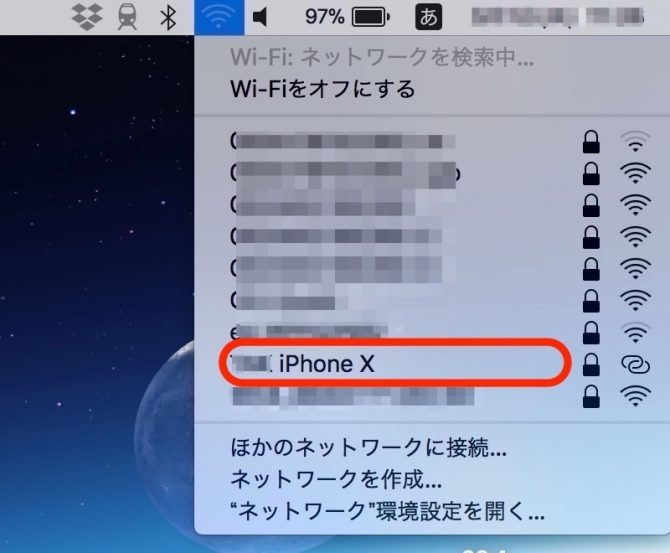 次は MacBook側で メニューバーのWi-Fiアイコンをクリックすると 上記のように ネットワーク一覧が表示され 赤丸で囲った インターネット共有の欄には 接続先である「iPhone」が表示されるので 選択します。