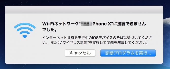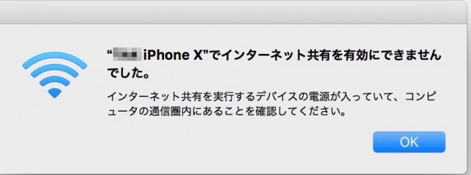 インターネット共有を有効にできませんでしたのアラートが出まくりです。