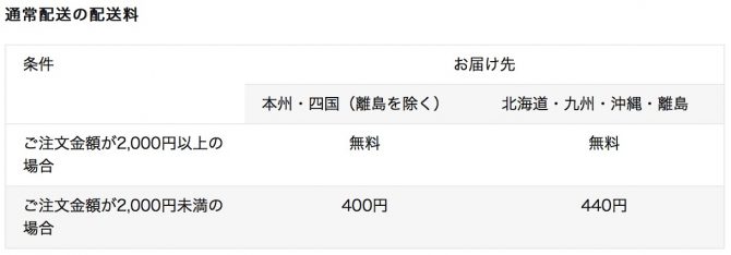 値上げ金額のピックアップをすると 2000円未満の注文で 配送料が一律350円だったのが、値上げ後は 本州・四国で 400円、その他の地域が 440円と改定となっています。