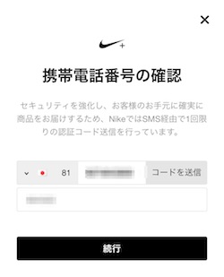 「Nike +」のログインを済ませると 今度は個人認証として 携帯電話番号の入力を求められ、SMS経由で認証コードが送信されます。