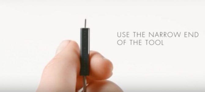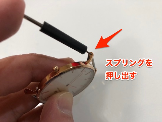 NATOストラップを外したら 本体を購入した時に付属していた上述の工具を使って ピンを押し出すと スプリングピンを外すことができます。