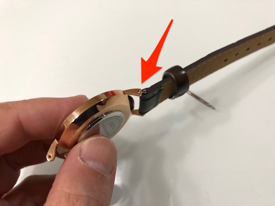 交換するベルト(ストラップ)に ピンを入れ 外す時と同じように ピンの先を押しながら ケース本体の穴に ピン先をはめ込みます。