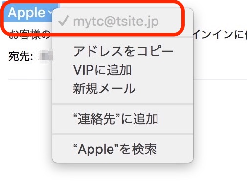 次に差出人をチェックすると名前は Appleとなっていますが 情報を見てみると 差出人アドレスが「mytc@tsite.jp」となっていました。
