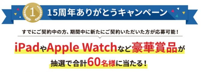 15周年ありがとうキャンペーンは 既に契約中の方と キャンペーン期間中に 新たに契約をした方が応募可能で 抽選で iPad 128GB+Apple Pencilのセットや Apple Watch Series 3 (GPSモデル)、Apple AirPodsなど 豪華な商品が抽選で当たるキャンペーンとなっています。