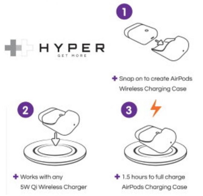 HYPER++ AirPods ワイヤレス充電アダプタは、任意の5W Qiワイヤレス充電器(別売)で動作し Apple AirPods充電ケースを1.5時間でフル充電することができるようです。
