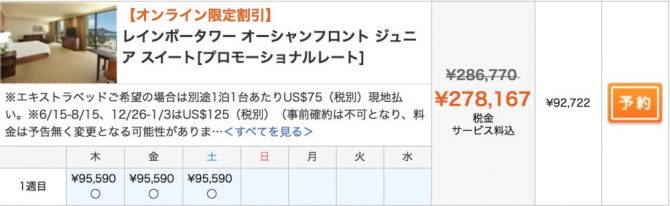旅行代理店(H.I.S.)で上記と同じジュニアスイート、宿泊数、人数を同様に算出してみると