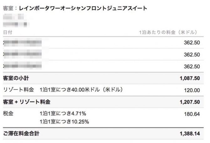 州税とリゾート料金が加算され 合計金額は $1,388.14になります。
