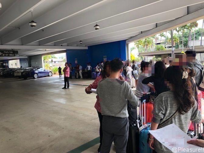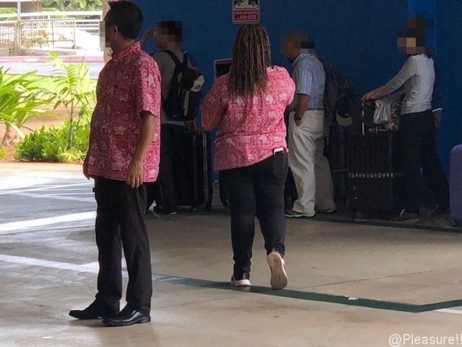 個人用出口を出ると 上の写真のようにサインボードを持った真っ白い制服のスタッフがいるはずだったのですが 実際には周りを見渡しても 白い制服スタッフは見当たらず 出口付近を家族4人で キョロキョロしていましたら ピンクのアロハシャツを着たスタッフ(下記写真)に 日本語で「○○さん?」と声を掛けられ 向こうから見つけられてしまいましたw