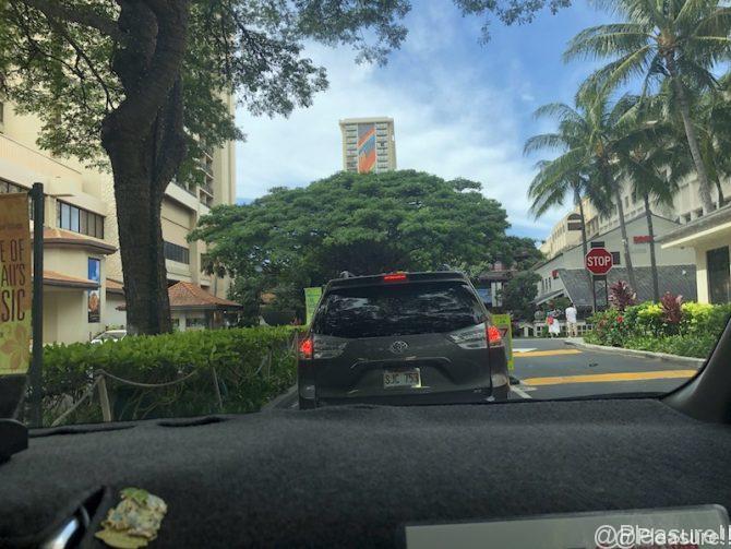 車中で ドライバーさんと話した会話といえば 目的地のホテル名と泊まるタワーである「レインボータワー」と告げたくらいで 車内には iPhoneと接続していた レゲエ調の曲が 心地よい音量で流れ 家族全員ハワイの街並みを眺めながら あっという間にホテルに到着した感じでした。