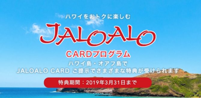 JALOALO(ジャロアロ)カードとは、JALが発行している無料のプログラムカードで ハワイ島・オワフ島での滞在中に JALOALOカードを掲示すると レインボートロリーの無料乗車が出来るようになる等、様々な特典が受けられるようになるプログラムカードです。