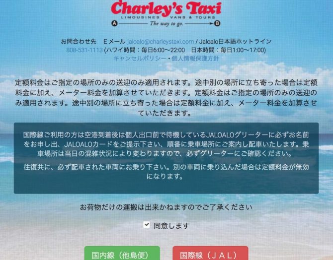 JALOALO(ジャロアロ)カード特典で タクシー予約が出来るのは、ハワイで超有名な定額制タクシー会社「チャーリーズタクシーです