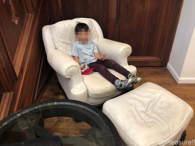 クロムハーツの店舗は 模造(複製)を防ぐため 店内撮影を禁止しているはずなのですが ホノルル店の美人スタッフから クロムハーツの高級ソファに座っている息子氏の撮影を許可していただき リラックスモード全開で息子氏もご満悦の模様です。