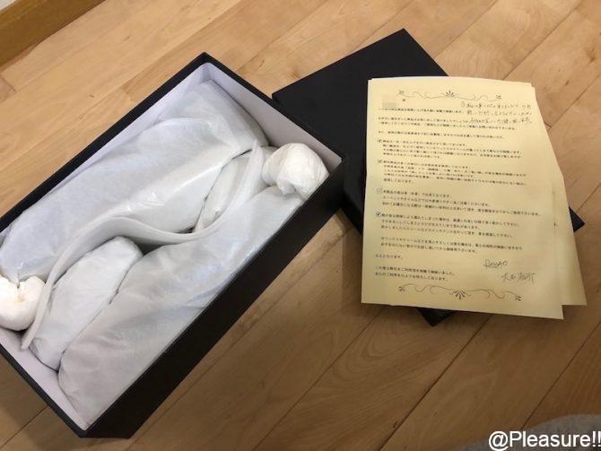 「レイマー」の外箱を開けてみると 丁寧に梱包された靴本体と注意書きが同封されています。