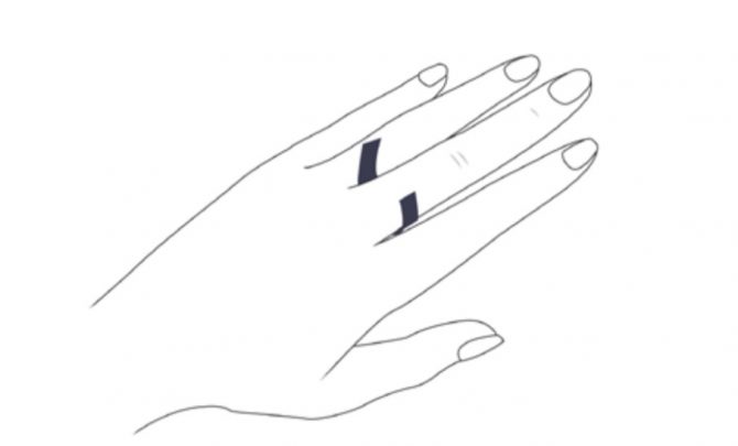 次に測定に使っている紙もしくは紐を指の一番太い部分(第2関節辺り)に移動しもう一度巻き付け、目印をもう1箇所付けます。