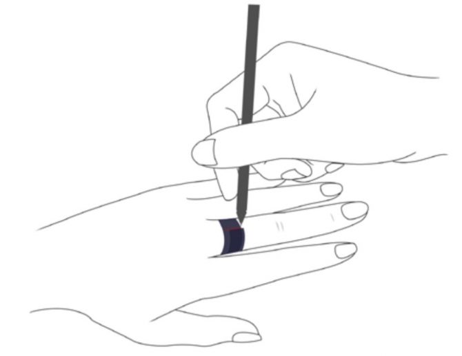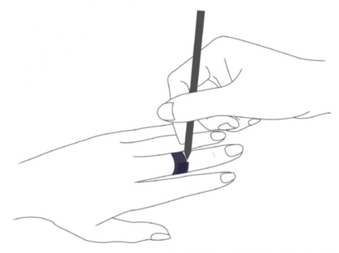 「指のつけ根」を1周巻き付けて重なった部分にペン等で目印を付けます。