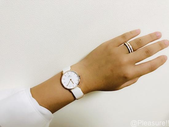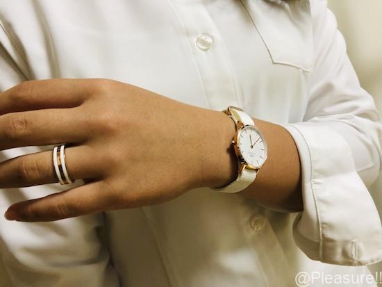 オフホワイトストラップの「Classic Petite Dover 28mm」に 同ブランドの新作リング「CLASSIC RING SATIN WHITE(5,800円税抜)」をセレクト。