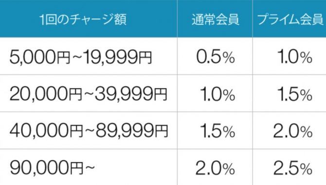 通常会員は最大2.0% プライム会員は最大2.5%ポイントが貯まるので チャージしないと損です。
