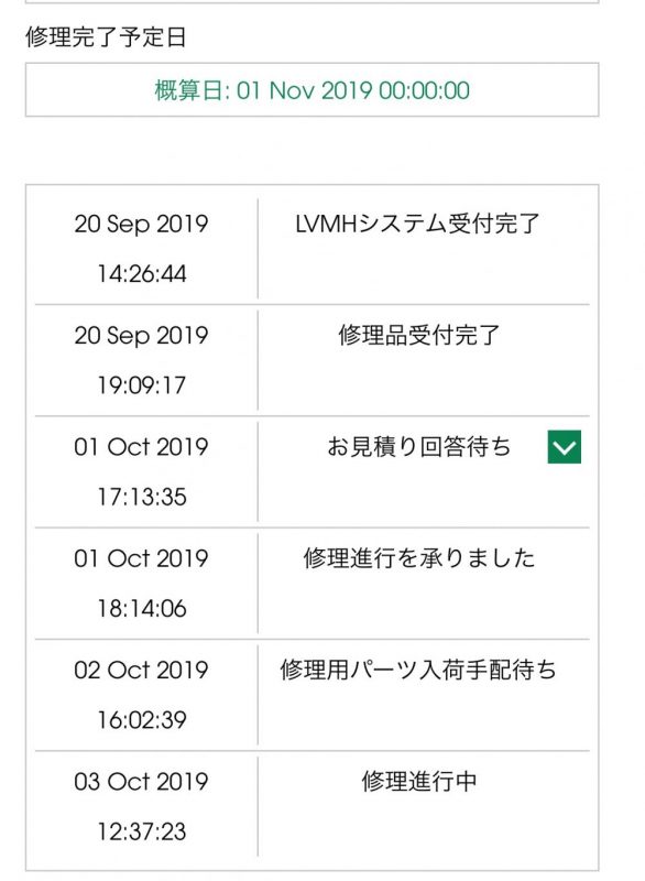 重要なのは 「修理完了予定日」が 11月1日と表示されていることで、ワタシの場合 決済を行なった日付が 10月1日でしたので タグ・ホイヤーでの正規オーバーホールに掛かる日数は 1ヶ月位といったところでしょうか。