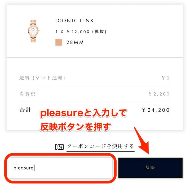 そこに 当サイトクーポンコード「pleasure」を入力し「反映」ボタンを押してください。