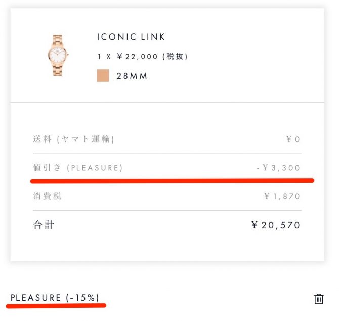 クーポンコードが適用されると 上記の通り 15%の値引き額が表示され 合計金額が 反映されます。