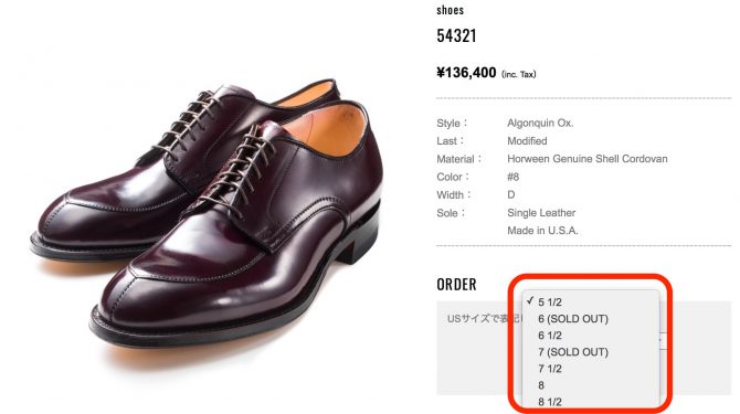 オールデン人気のコードバンシューズ、バーガンディの「ALDEN 54321」も ご覧の通り サイズによって「在庫あり」となっていますね!