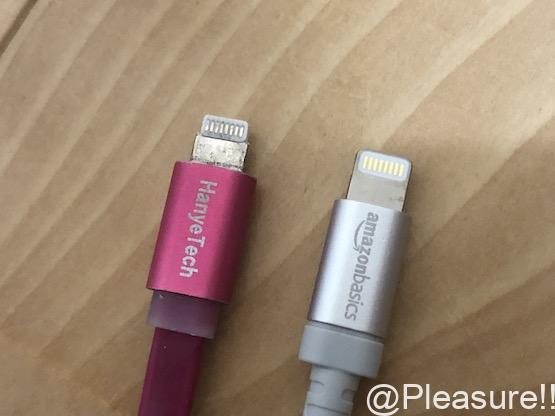 2本のLightning端子を見比べてみると、嫁氏が使っていたケーブル(Hanye Tech製)は 充電端子が壊れていることに気付きました。