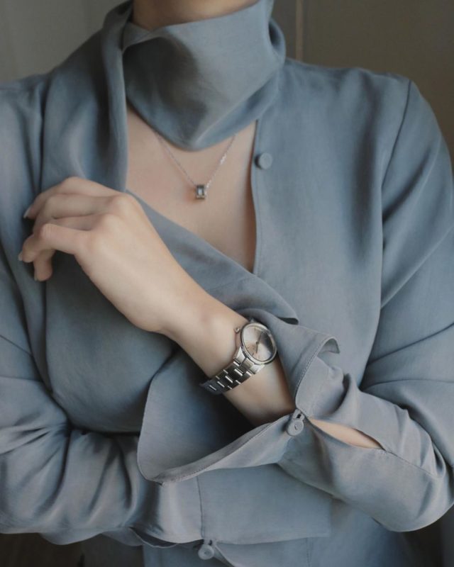 写真の様に落ち着いたトーンのブルー系の洋服と合わせると都会的で洗練された印象になります。