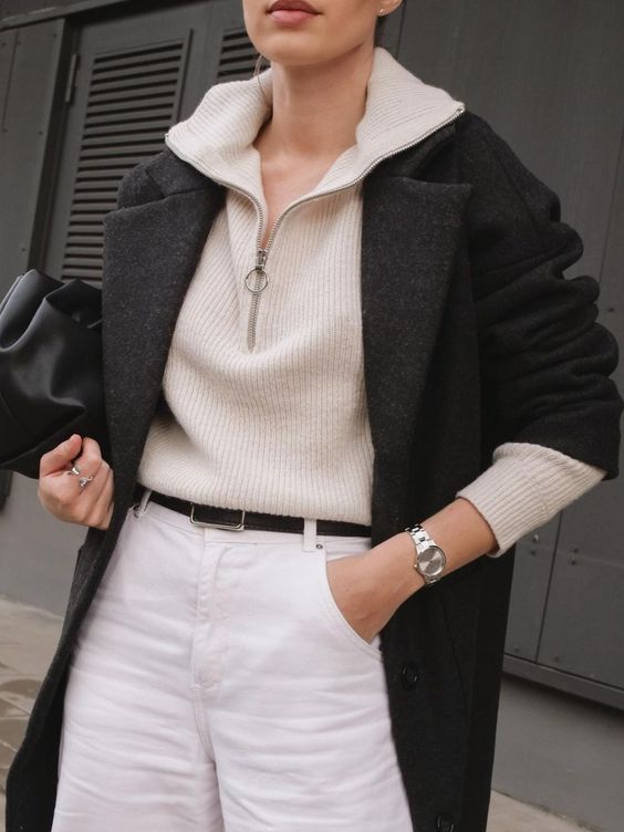 写真のように淡いホワイト系のジャケットに合わせ 紺のパンツ、ブラウンのドレスシューズでセットすることで落ち着きのある秋コーデが完成!