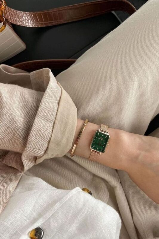 エメラルドグリーンは 一見するとファッションに合わせずらいという印象がありますが、ローズゴールドのケースカラーを選ぶことでオシャレスタイルが完成!