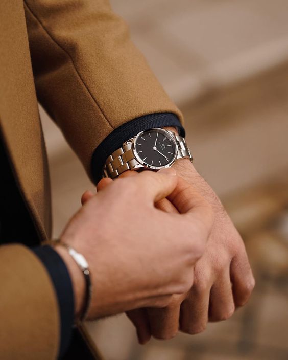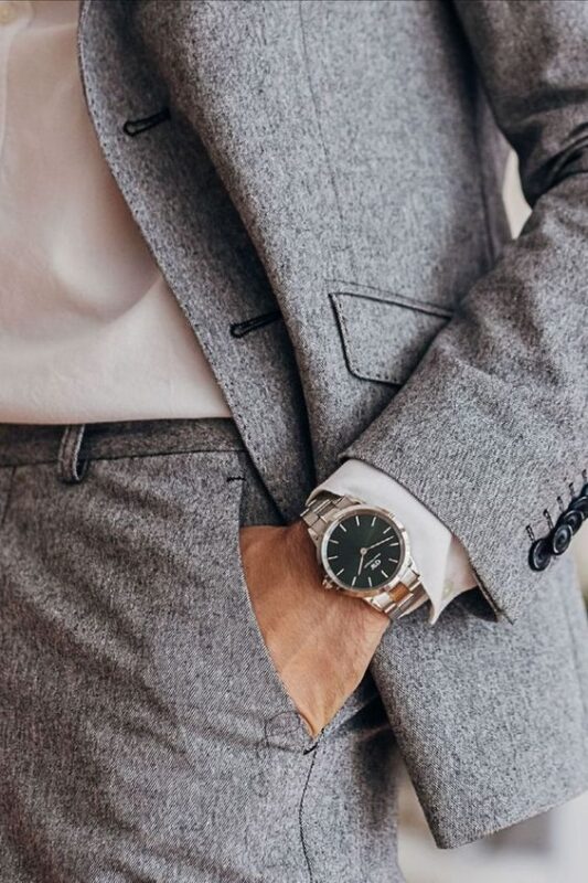 写真のようにグレーのスーツでコーデするとシルバーカラーの腕時計は 手首周りの引き締め効果があり特にグレーやネイビー系のスーツと非常に相性が良いです。