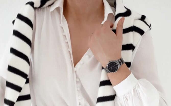 ケースサイズが 少し大き目なので、写真のように少しフェミニンなブラウスを合わせると女性らしさを失わずに腕時計とコーデできますね。