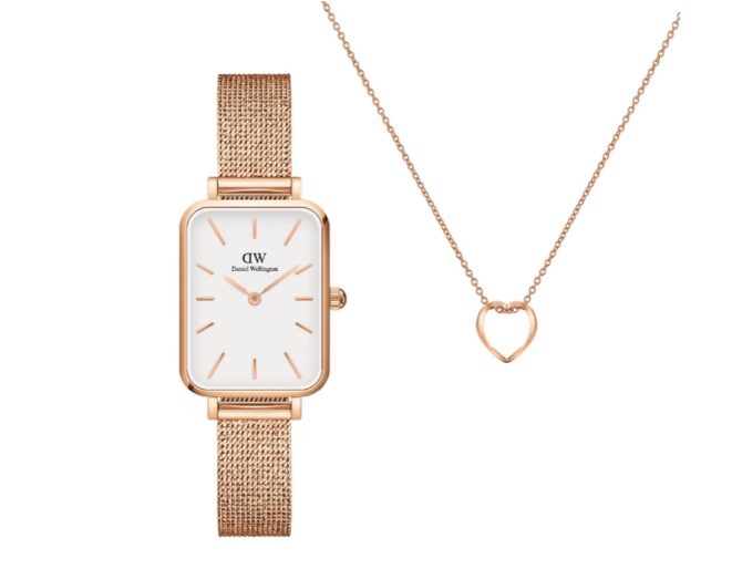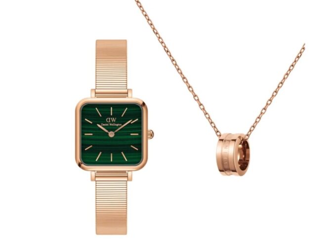 エメラルドグリーンの文字盤が際立つ新作時計の「Quadro Studio Green」と ダニエルウェリントンの中でも人気の高いローズゴールドのネックレス「Elan Necklace」が組み合わさったギフトセットです。