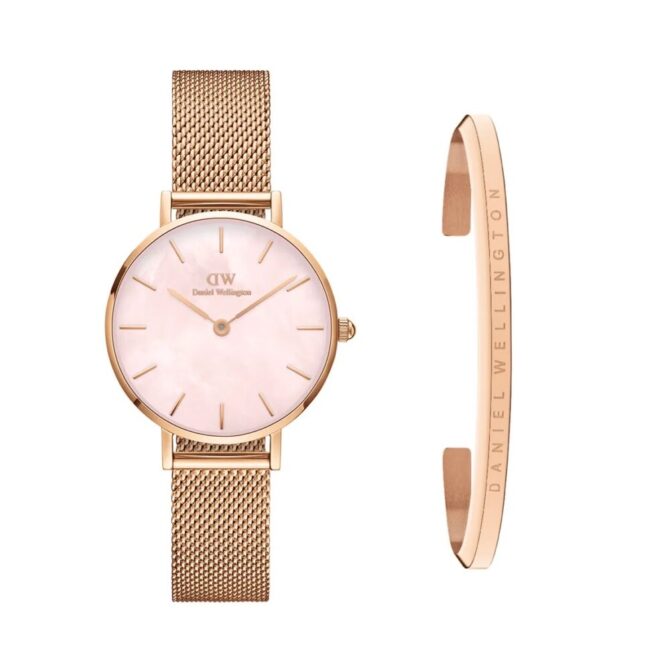 丸型のケースとメッシュベルトが特徴の「PETITE MELROSE PEARL」と、ダニエルウェリントンのアクセサリーの中でも大変人気のあるカフスタイプのブレスレットがセットになったギフトセットは、時計周りに重ね付けコーデが楽しめるのでプレゼントでも喜ばれます!