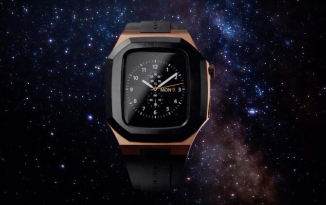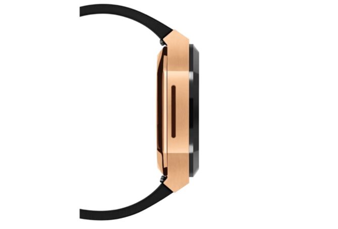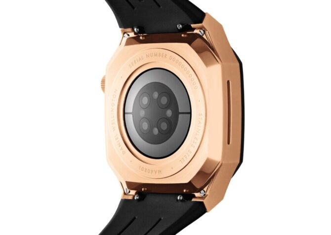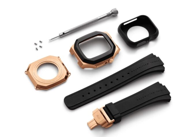 ケースカラーはローズゴールドを配色したステンレス製、ストラップはブラックのFKMゴムを採用し サイズは40mmと44mmのApple Watchに準拠した2サイズが展開されています。