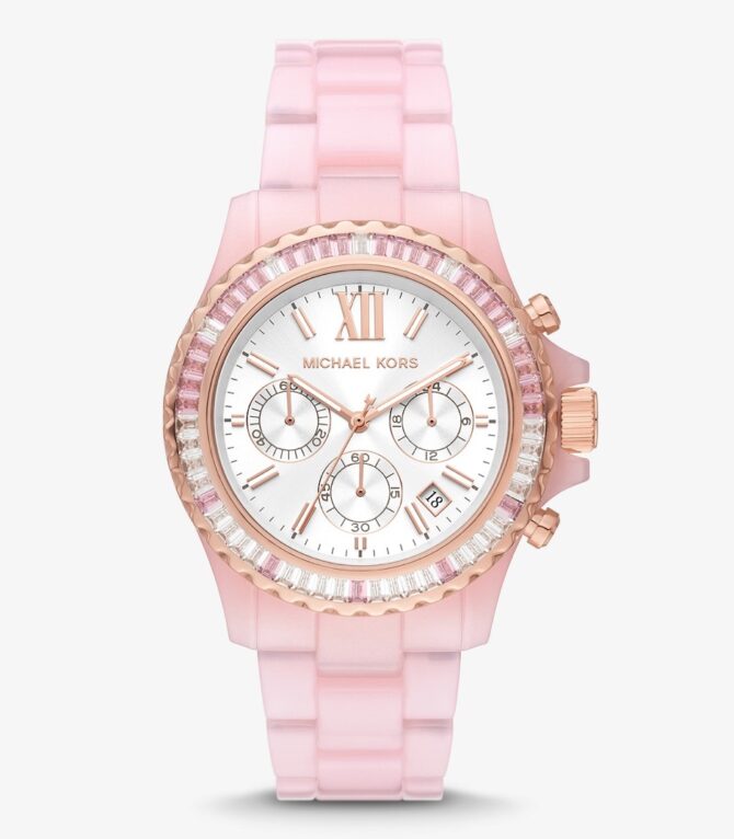 「EVEREST サステナビリティー ウォッチ」は、ピンク色のストラップに ローズゴールドのケースとホワイトピンクのクリスタルが装飾された魅力的な一本。