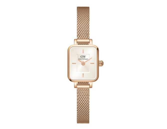 時計とジュエリーの中間点を目指してデザインされた「Quadro Mini」は、シャンパン色のコンパクトなQuadro文字盤に、洗練されたサンレイ仕上げを施し、2つのインデックスマーカーでミニマルな外観を演出。ダニエルウェリントン史上最小サイズとして登場し織物のようなメッシュブレスレットは、エレガントな魅力を腕元に与えます。