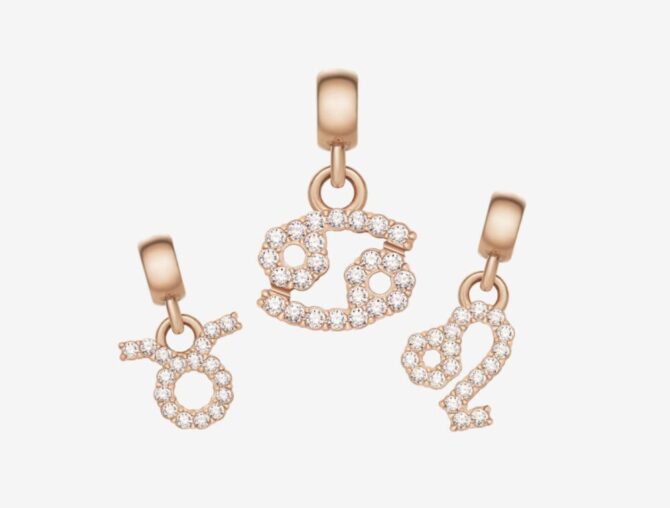 クリスタルがあしらわれた星座のシンボルチャームが手元で輝く美しい仕上がりとなっており手作業でのクロー・セッティング(爪留め)が行われています。